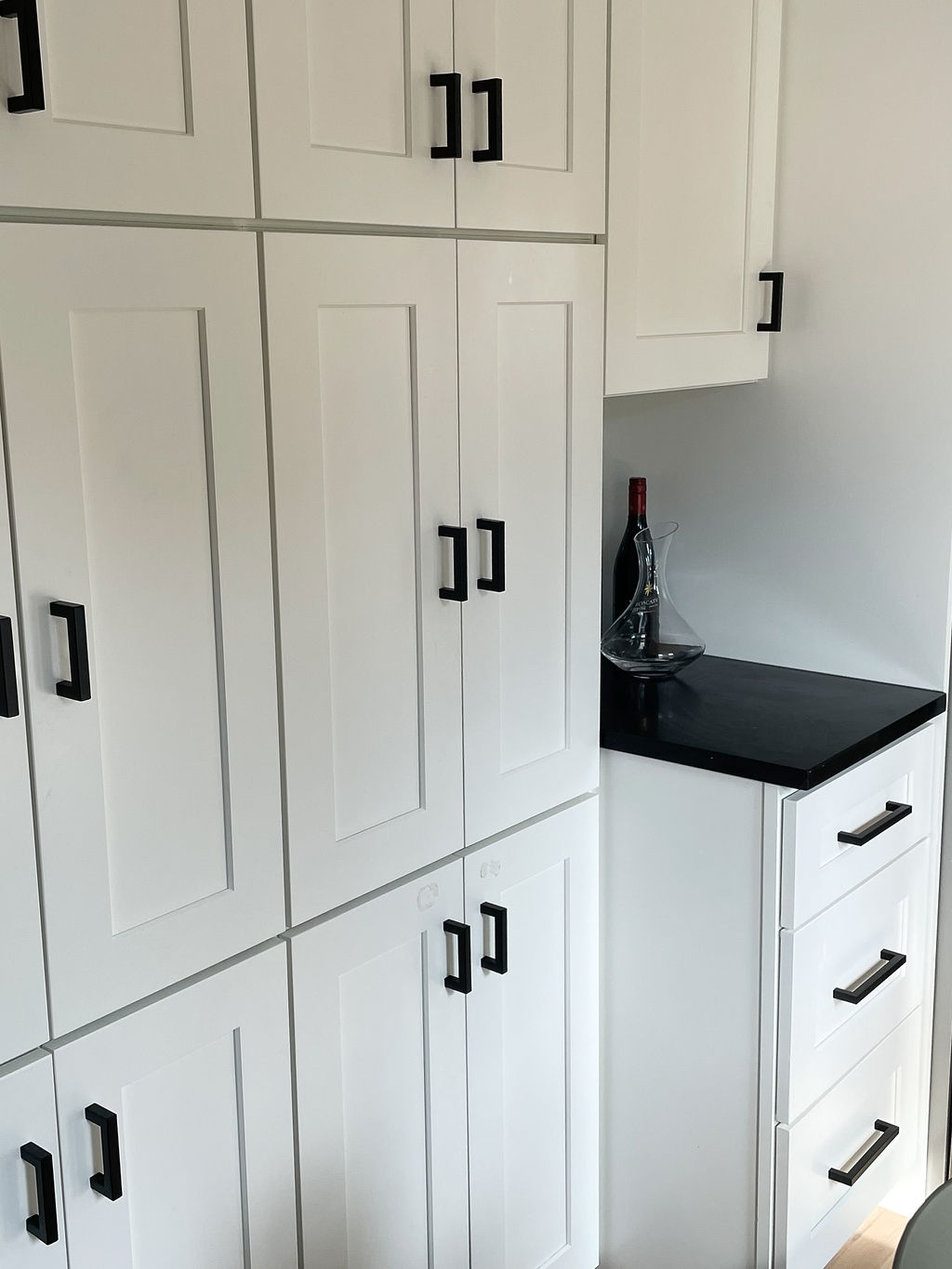 The solution began with selective wall removal and new structural framing to open the kitchen to adjacent living spaces. This created a visual and functional connection to the dining area, inviting natural light to fill the space and transforming how the room felt. White cabinetry was chosen for a timeless, clean backdrop, paired with matte countertops that offer subtle texture and understated elegance. Dark hardware, fixtures, and accent elements introduced a modern monochrome contrast, grounding the space and adding depth without compromising the bright, open atmosphere.