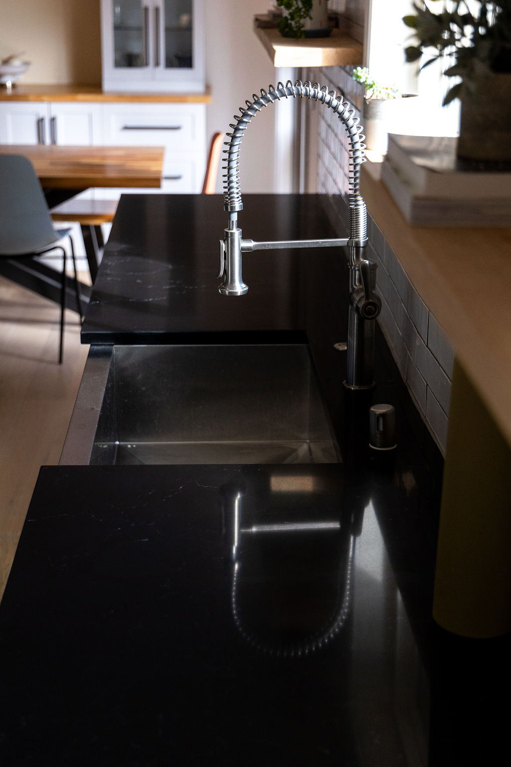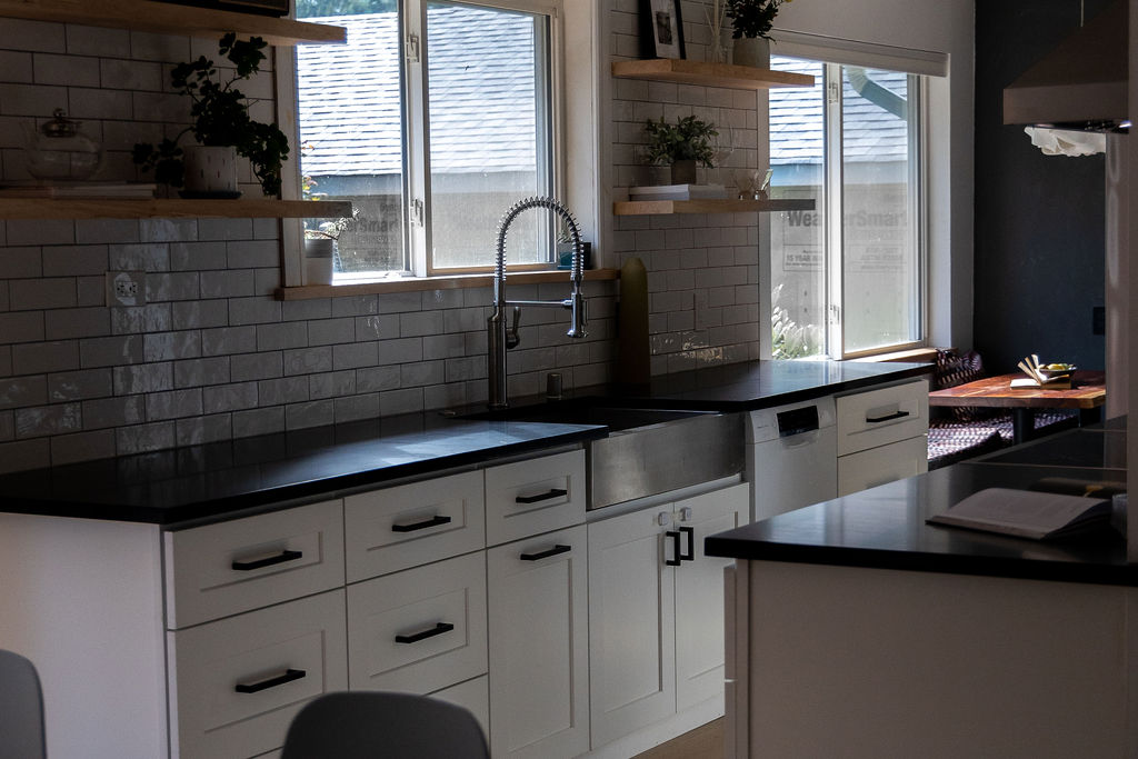 The completed kitchen remodel turns a once closed 1960s galley into a modern, inviting hub. The monochrome accents and bright white cabinetry create visual contrast and elegance, while the open layout connects seamlessly to the dining area, encouraging interaction and shared moments. Kara and Eero now enjoy a kitchen that is functional, stylish, and welcoming, a space that elevates both daily life and entertaining.